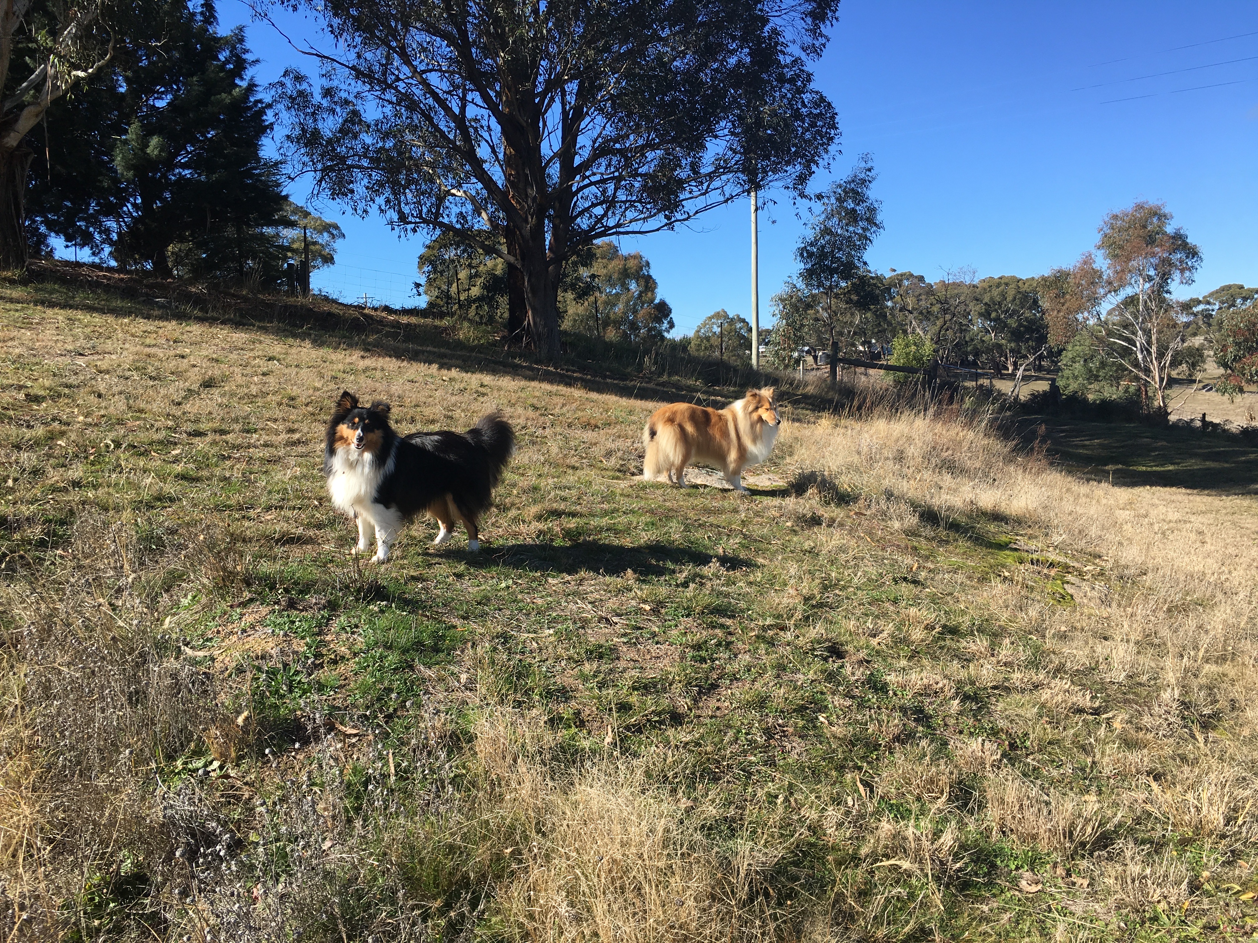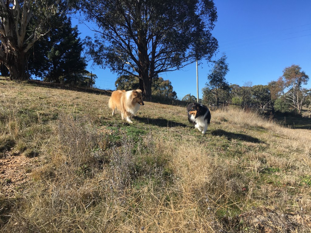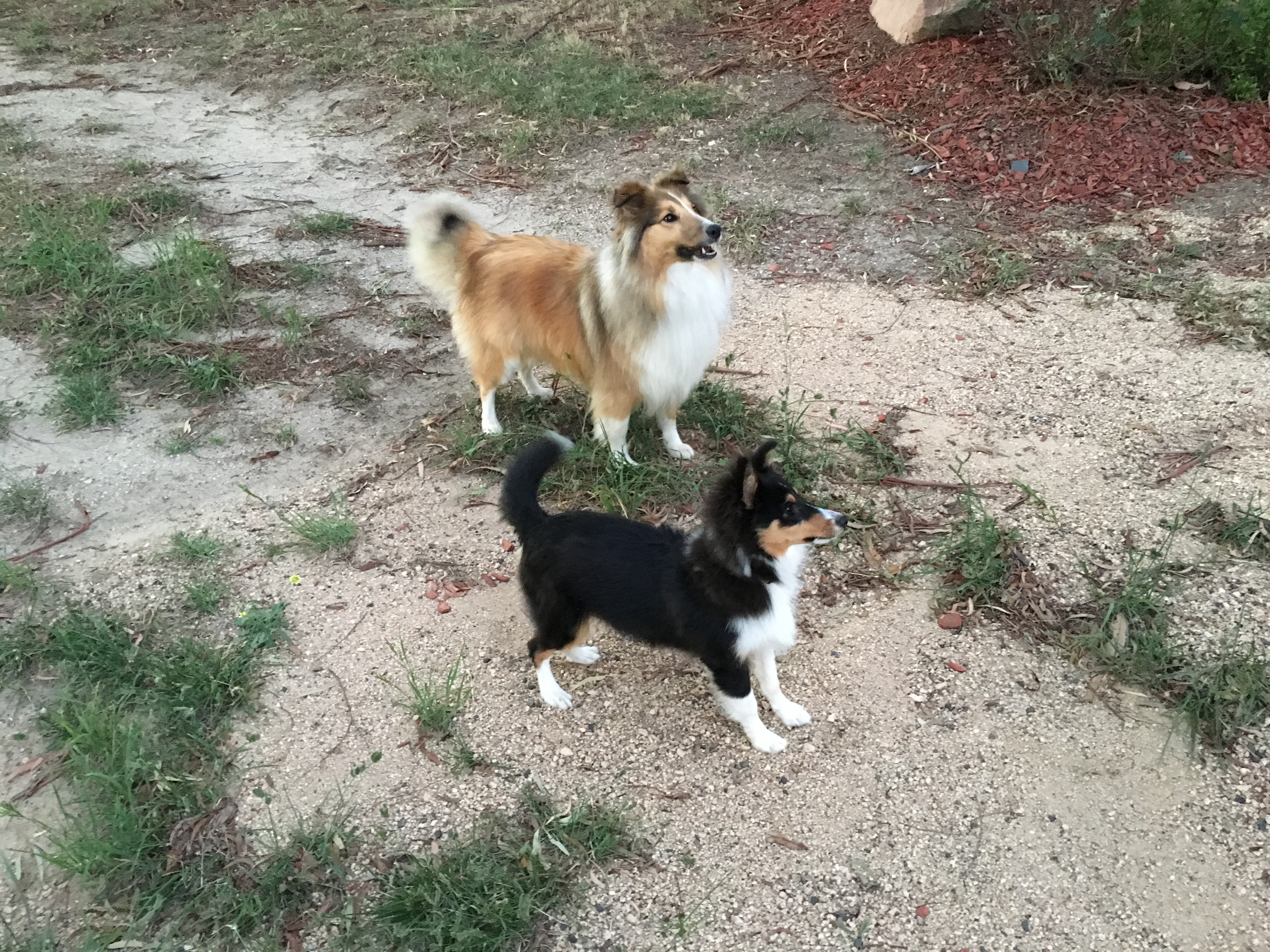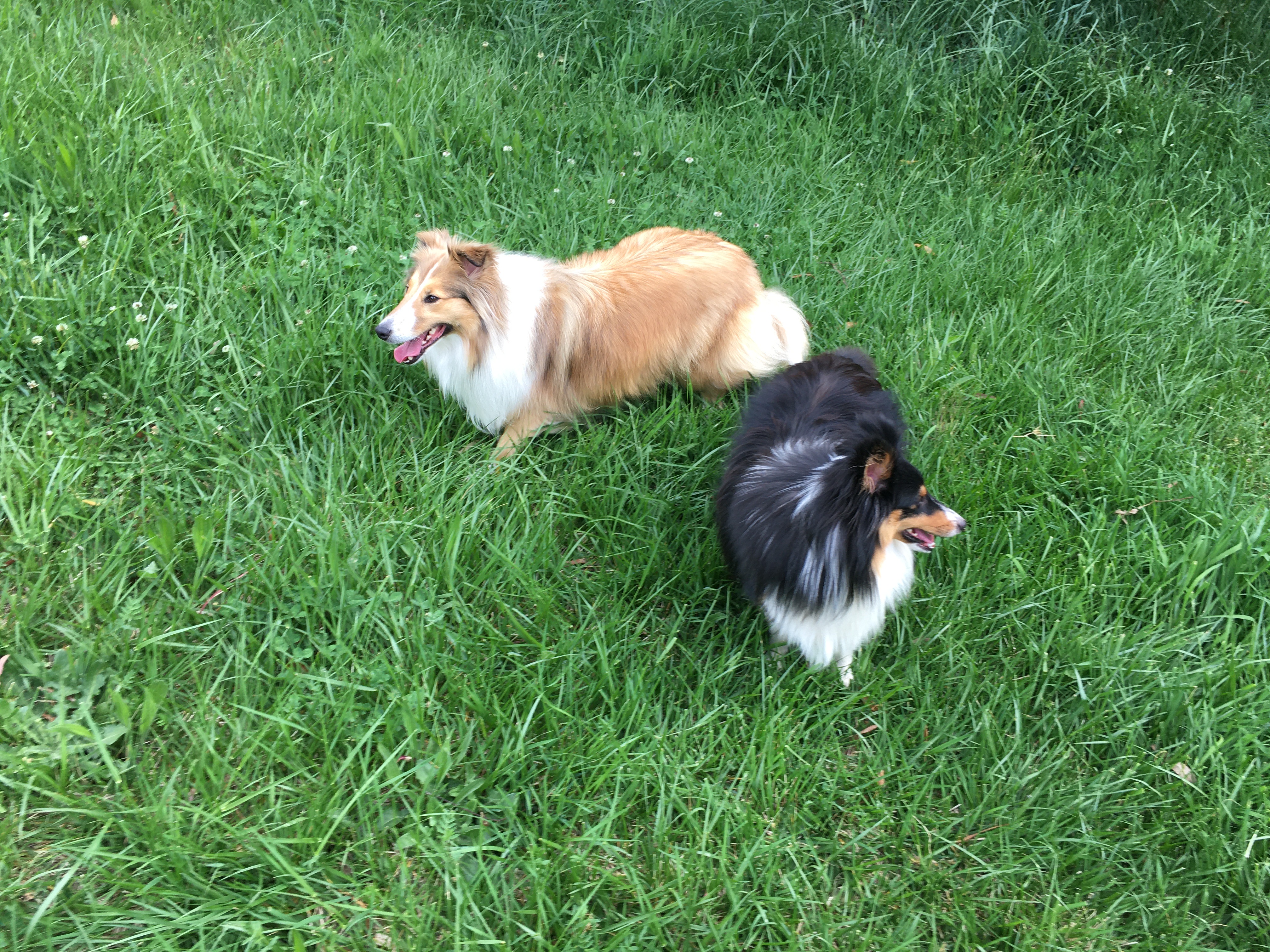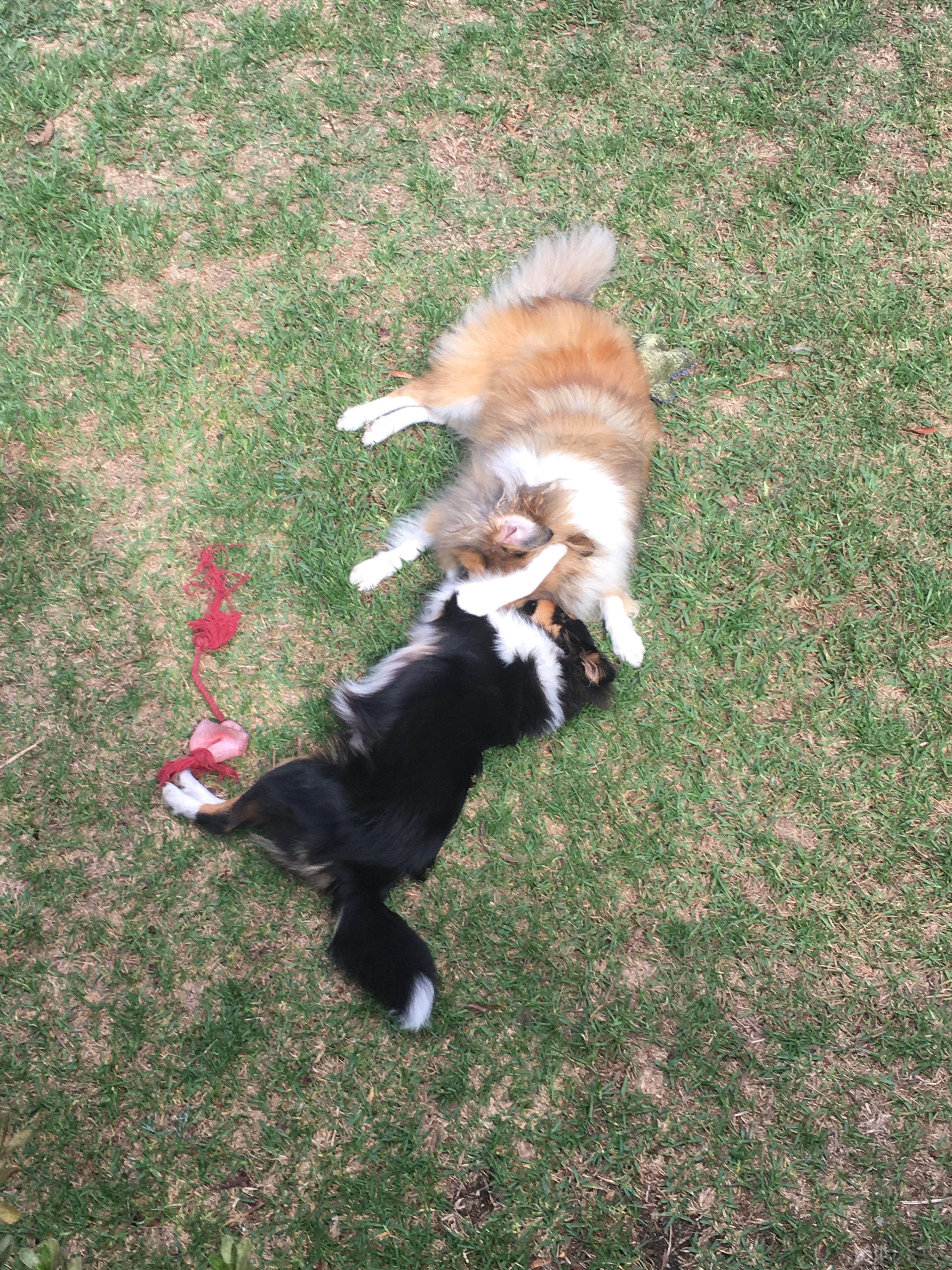 I just love watching my puppies play. Shelties are a playful breed but only when they feel secure in their environment. Our little Theo (tri-coloured) freezes when he is insecure but his older sister, Nala, (sable) gets anxious and makes this terrible crying sound. So it puts such a smile on my face and such joy in my heart when they engage in play. It’s wonderful to see them relaxed playing their game and passionate about their participation. It is then that the true nature of the sheltie is revealed.